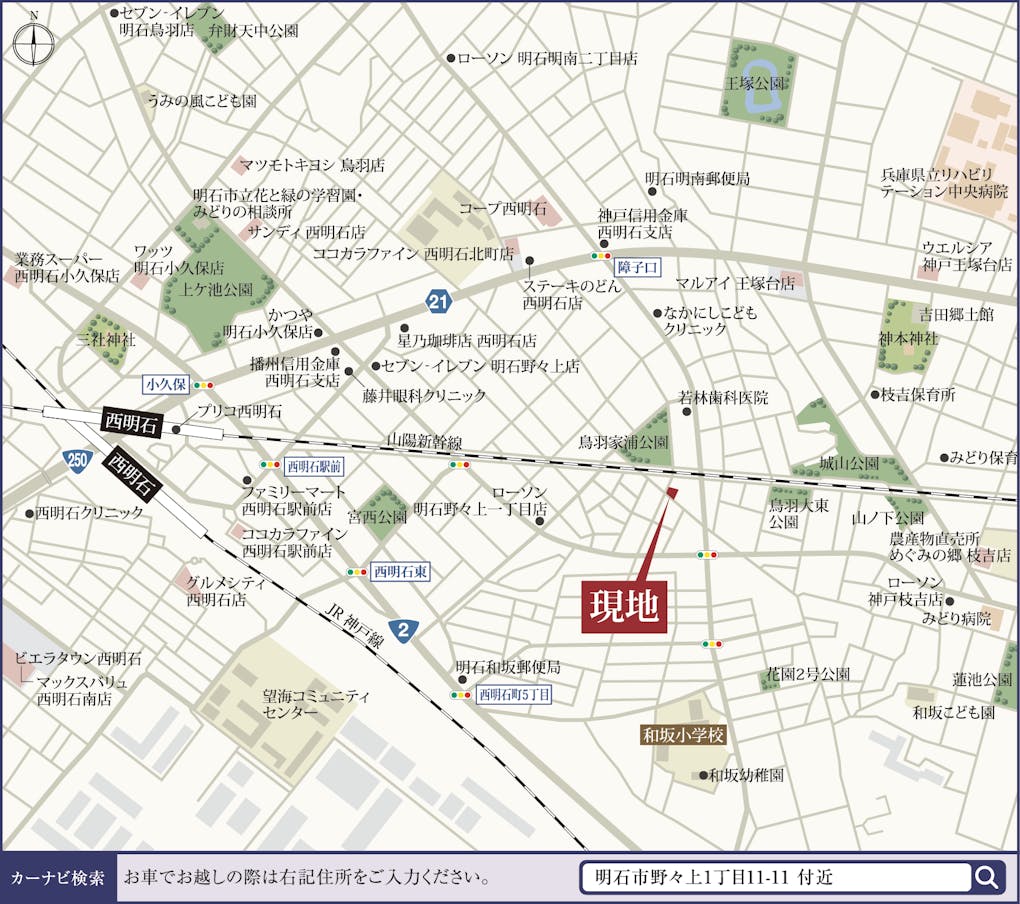 | 交通 | JR神戸線「西明石」駅まで徒歩12分 |