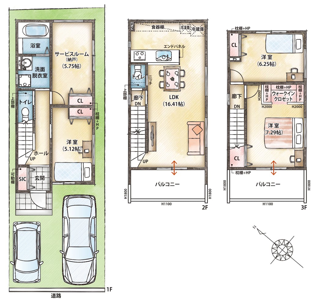 ・約5.75帖のサービスルーム(納戸)、シューズインクロゼット、ウォークインクロゼット付き