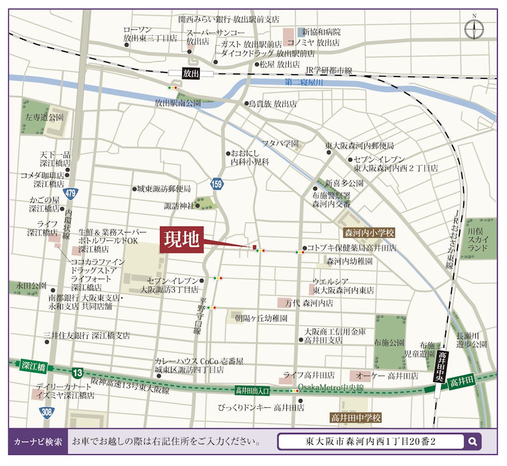 | 交通 | JR学研都市線・おおさか東線「放出」駅まで徒歩11分 JRおおさか東線「高井田中央」駅まで徒歩13分 OsakaMetro中央線「高井田」駅まで徒歩13分 OsakaMetro中央線「深江橋」駅まで徒歩14分 |