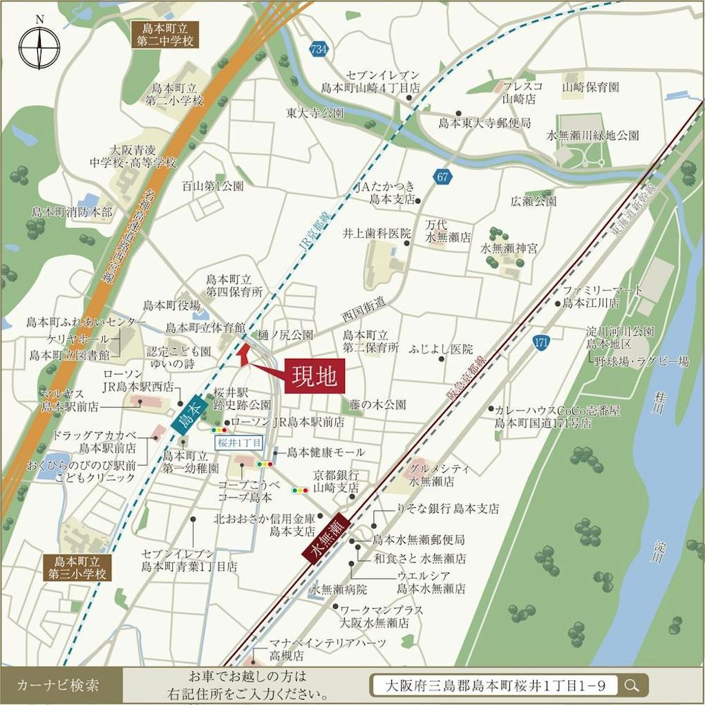 ・お車の場合:カーナビでは【大阪府三島郡島本町桜井1丁目1-9】をご登録ください